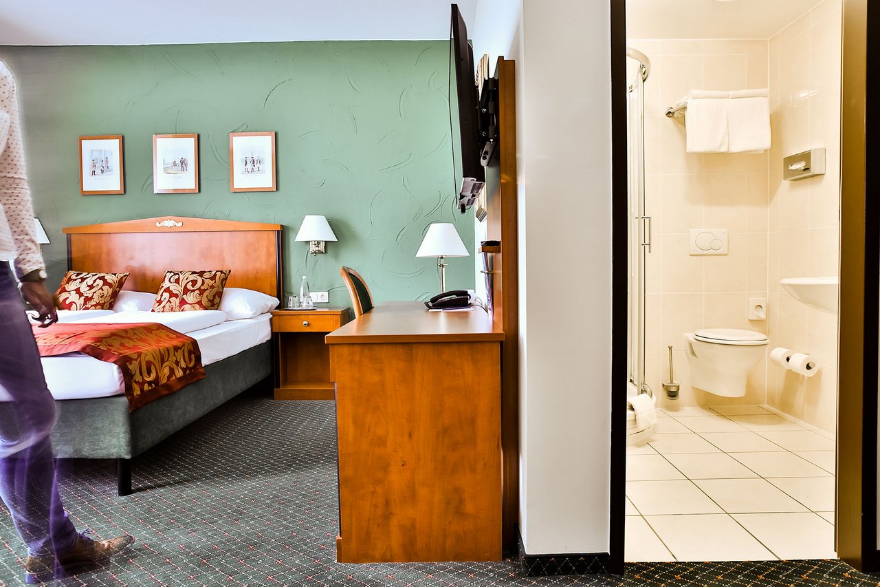 Strong reds and greens dominate the decor of our rooms and reflect the English country style. Our rooms are furnished with single or double beds, a generously-sized desk and seating area, TV with TV guide, wardrobe, telephone, safe, as well as WC and shower or bath.