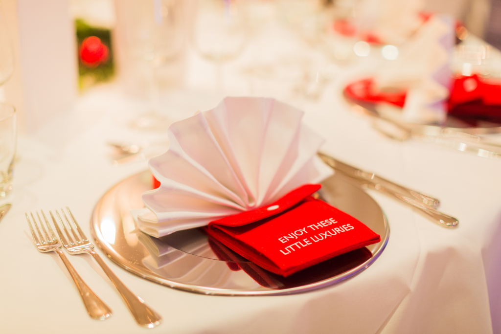 - Vorbereitet und eingedeckt mit Platzteller, Covert, Weinglas und Menagen