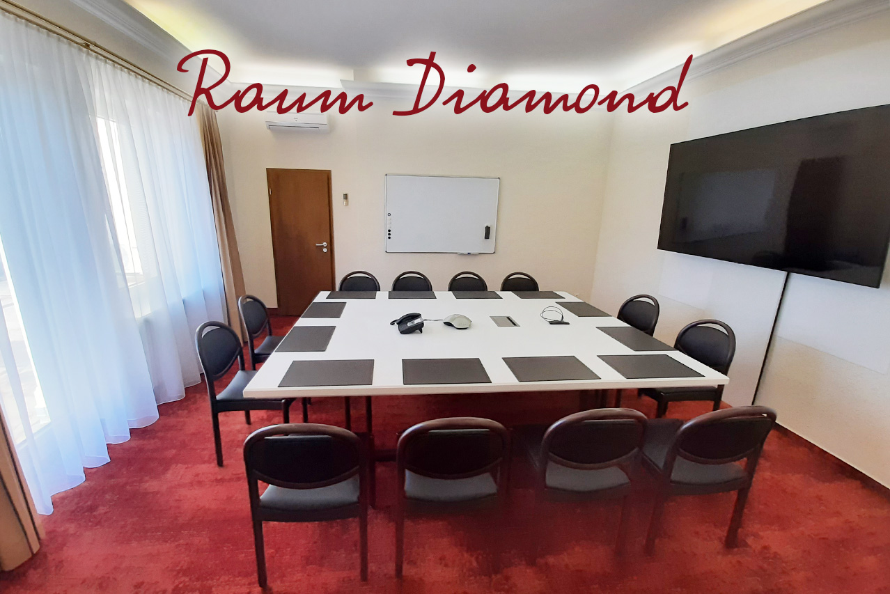 • Diamond  – 190,00€ ~27m², Konferenz- Blockbestuhlung bis max. 12 Personen, Klima, Whiteboard mit Stiften, Flatscreen 82″ mit Anschluss für Laptop/Tablet